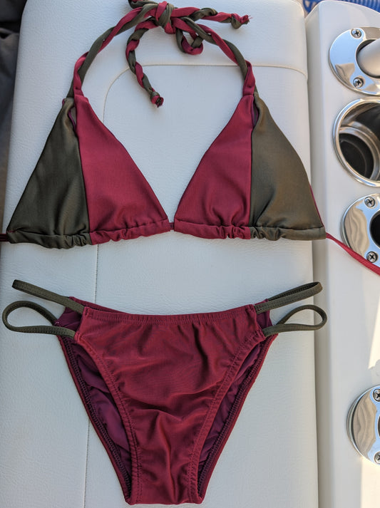 Traje de baño elegante de dos piezas en color granate y oliva con lazos trenzados